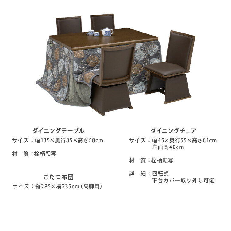 商品サイズ テーブル: 幅135×奥行85×高さ68cm チェア 幅45×奥行55×高さ81cm 座面高40cm こたつ布団: 縦285×235cm 材質 全体:栓柄転写板 塗装:UV塗装 商品詳細 テーブルは組立て式 手元コントローラー 天板固定可能 温度調節は無段階 商品説明 幅135cmで家族4人でゆったり使用できるダイニングテーブルタイプのこたつです。