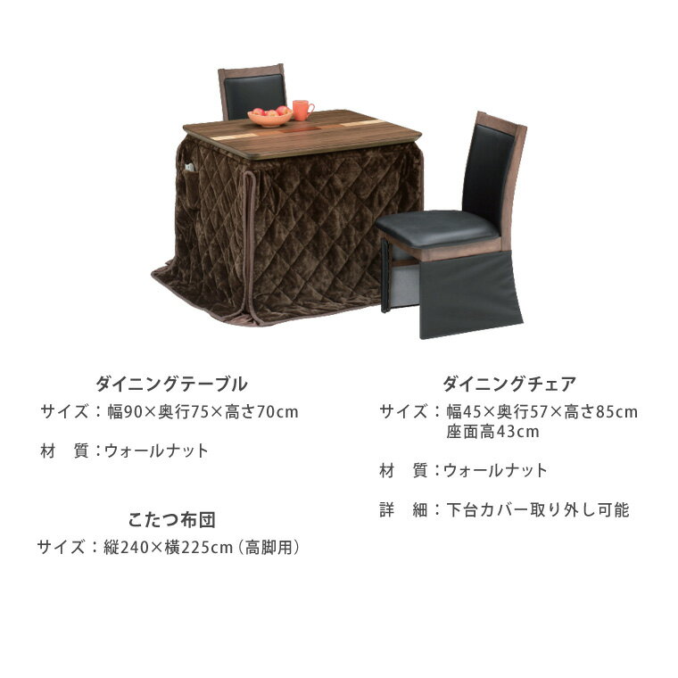 商品サイズ テーブル: 幅90×奥行75×高さ70cm チェア 幅45×奥行57×高さ85cm 座面高43cm こたつ布団: 縦240×225cm 材質 全体:ウォールナット 塗装:UV塗装 商品詳細 テーブルは組立て式 手元コントローラー 天板固定可能 温度調節は無段階 ウォールナット象嵌入り 商品説明 幅90cmで家族2人でゆったり使用できるダイニングテーブルタイプのこたつです。